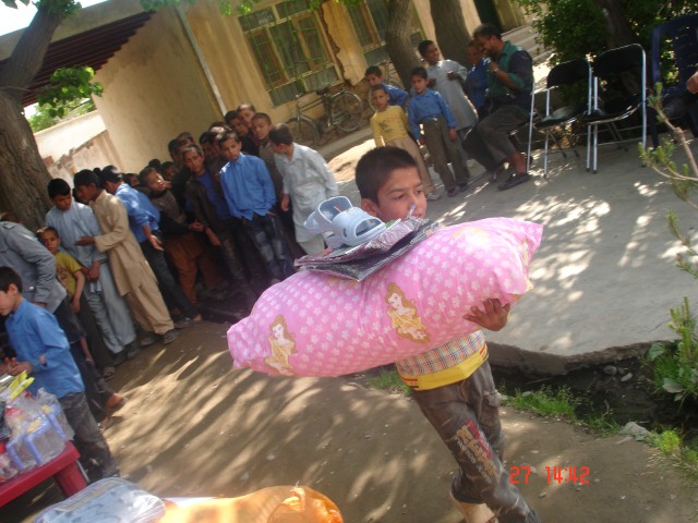 In the picture below, a child is walking away with his new sleeping pillow, sandals, and school supplies